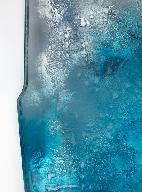 PRODUKTDETAILS Baked glass top and legs in two layers with irregular edges. The entire piece is varnished in gradation from blue to transparent, with partial silvering on the back.